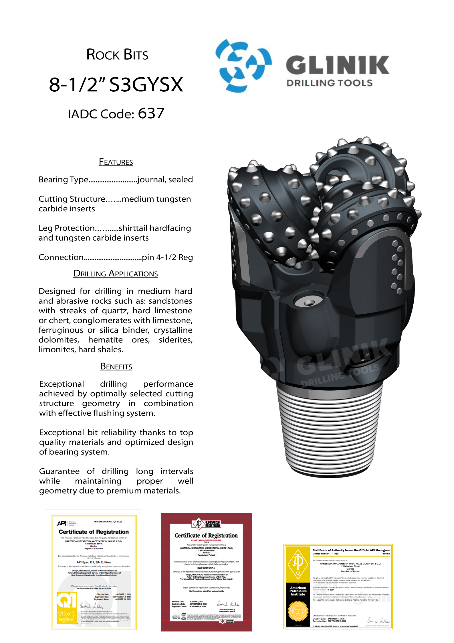 Diseñado para perforar en rocas medianamente duras y abrasivas, como areniscas con vetas de cuarzo, calizas duras o chert, conglomerados calcáreos, ferruginosos o con ligantes silíceos, dolomías cristalinas, minerales de hematites, sideritas, limonitas y esquistos duros.