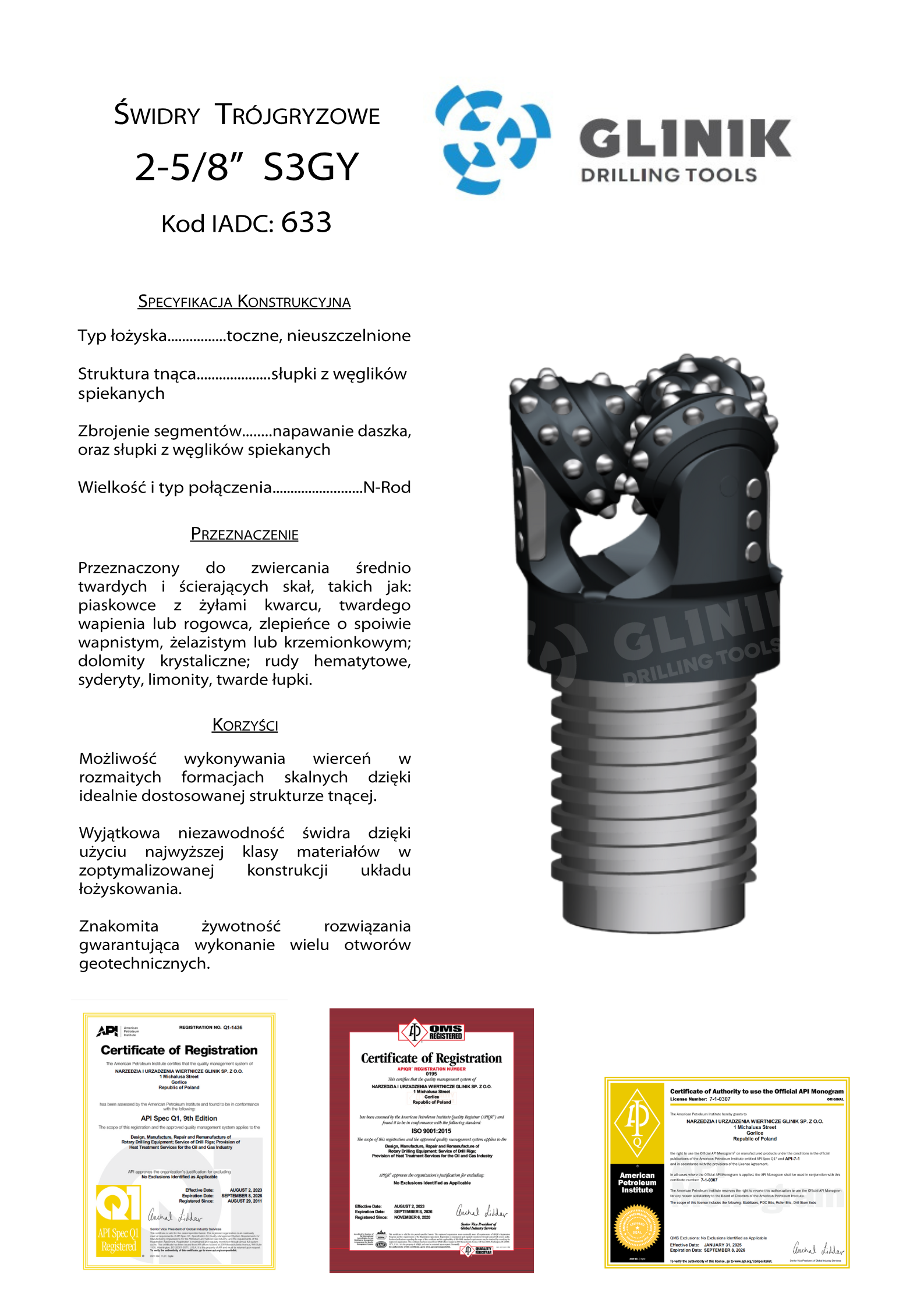 Świdry trójgryzowe, których struktura tnąca opiera się na wysokiej jakości słupkach węglikowych dostosowanych do przewiercanych formacji we wszystkich aplikacjach wiertniczych. W naszych rozwiązaniach wykorzystujemy łożyska uszczelnione i nieuszczelnione w zależności od preferencji Klienta. By zwiększyć ochronę średnicy używamy najwyższej jakości słupków z węglika spiekanego i trudnościeralnej napoiny. Wysoki postęp wiercenia jest zapewniony dzięki zastosowaniu efektywnego płukania struktury tnącej i dna otworu. Zakres średnic obejmuje od 2-3/8″ (60,3mm) do 28″ (711,2mm).