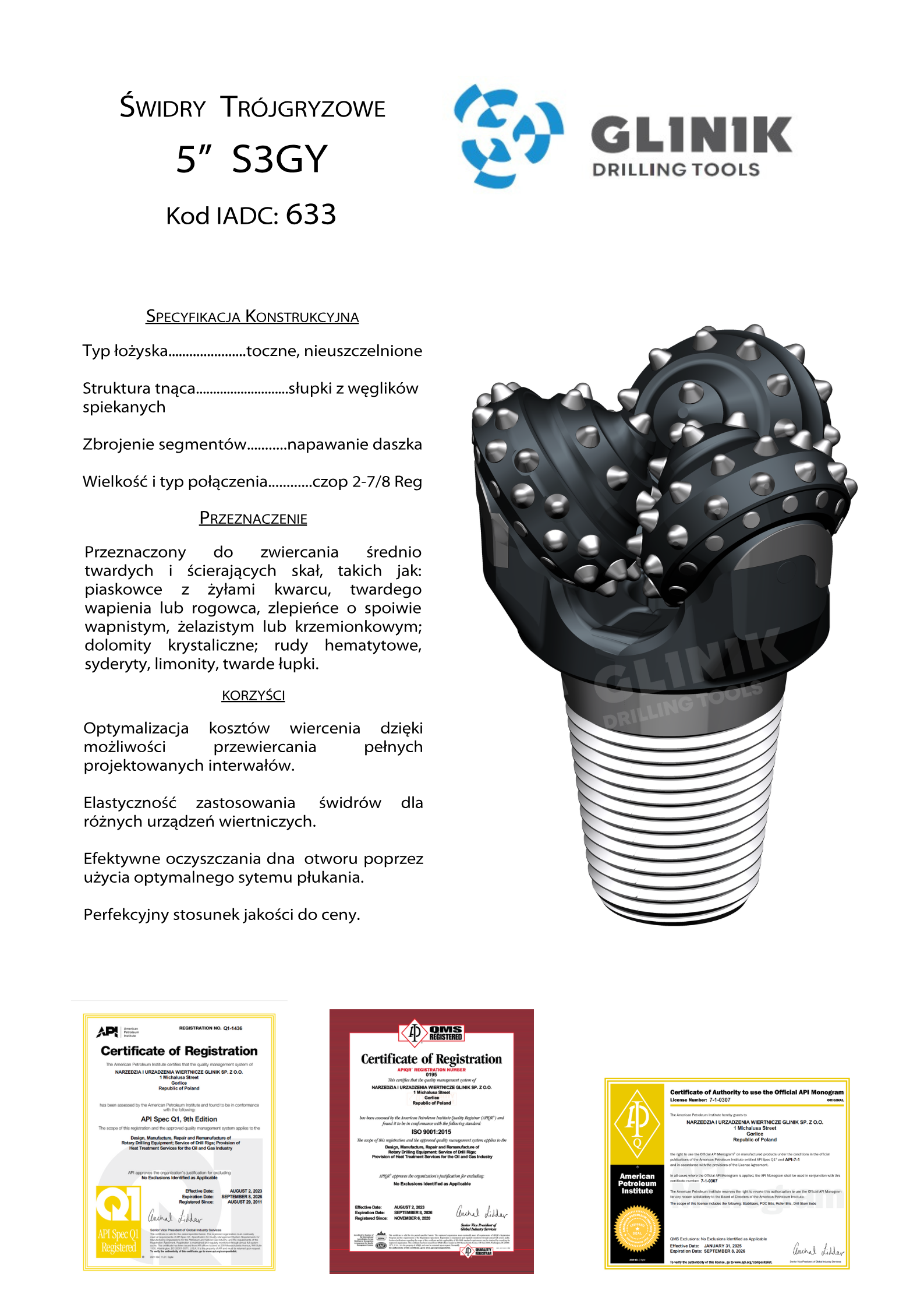 Optymalizacja kosztów wiercenia dzięki możliwości przewiercania pełnych projektowanych interwałów. Elastyczność zastosowania świdrów dla różnych urządzeń wiertniczych. Efektywne oczyszczania dna otworu poprzez użycia optymalnego sytemu płukania. Perfekcyjny stosunek jakości do ceny.