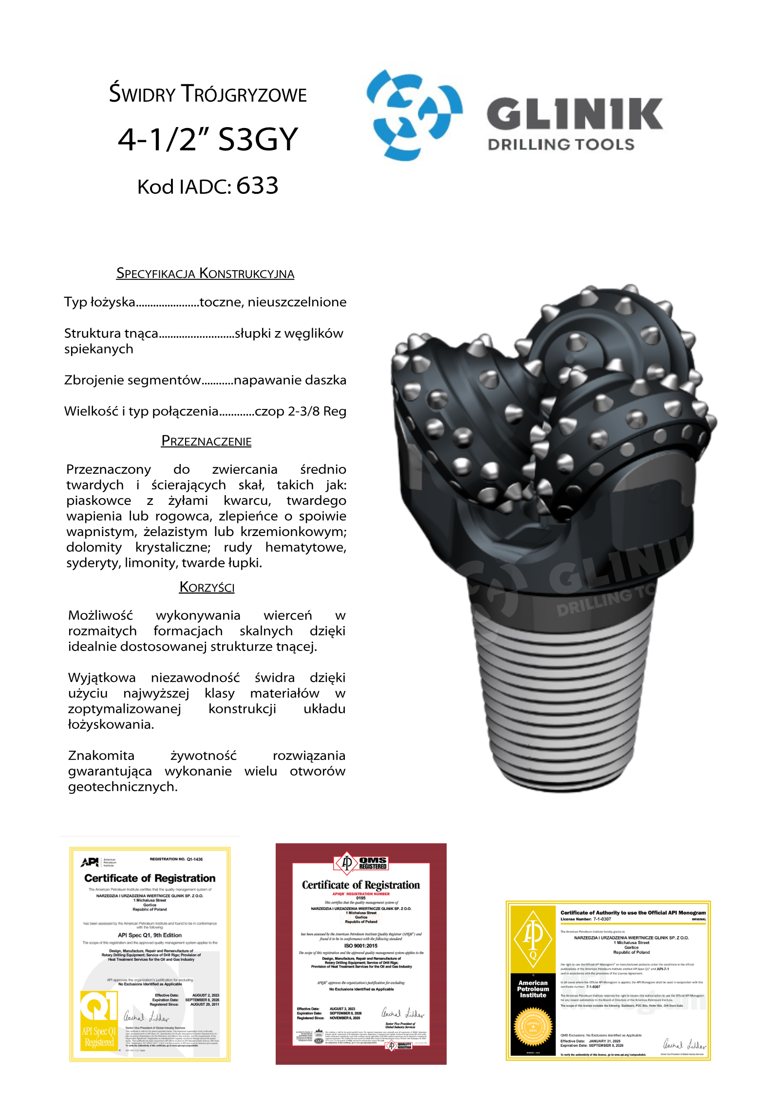 Świdry trójgryzowe, których struktura tnąca opiera się na wysokiej jakości słupkach węglikowych dostosowanych do przewiercanych formacji we wszystkich aplikacjach wiertniczych. W naszych rozwiązaniach wykorzystujemy łożyska uszczelnione i nieuszczelnione w zależności od preferencji Klienta. By zwiększyć ochronę średnicy używamy najwyższej jakości słupków z węglika spiekanego i trudnościeralnej napoiny. Wysoki postęp wiercenia jest zapewniony dzięki zastosowaniu efektywnego płukania struktury tnącej i dna otworu. Zakres średnic obejmuje od 2-3/8″ (60,3mm) do 28″ (711,2mm).